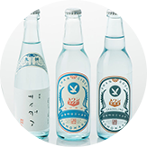 上質のグラニュー糖を溶かし込み、昔ながらの製法で製造している「スワンサイダー」、見る人までもが楽しい本物ビールそっくりの「こどもびいる」、ビー玉の入った懐かしい瓶でプチギフトにおすすめの「フルーラ」、割り材に最適な「炭酸水」。
