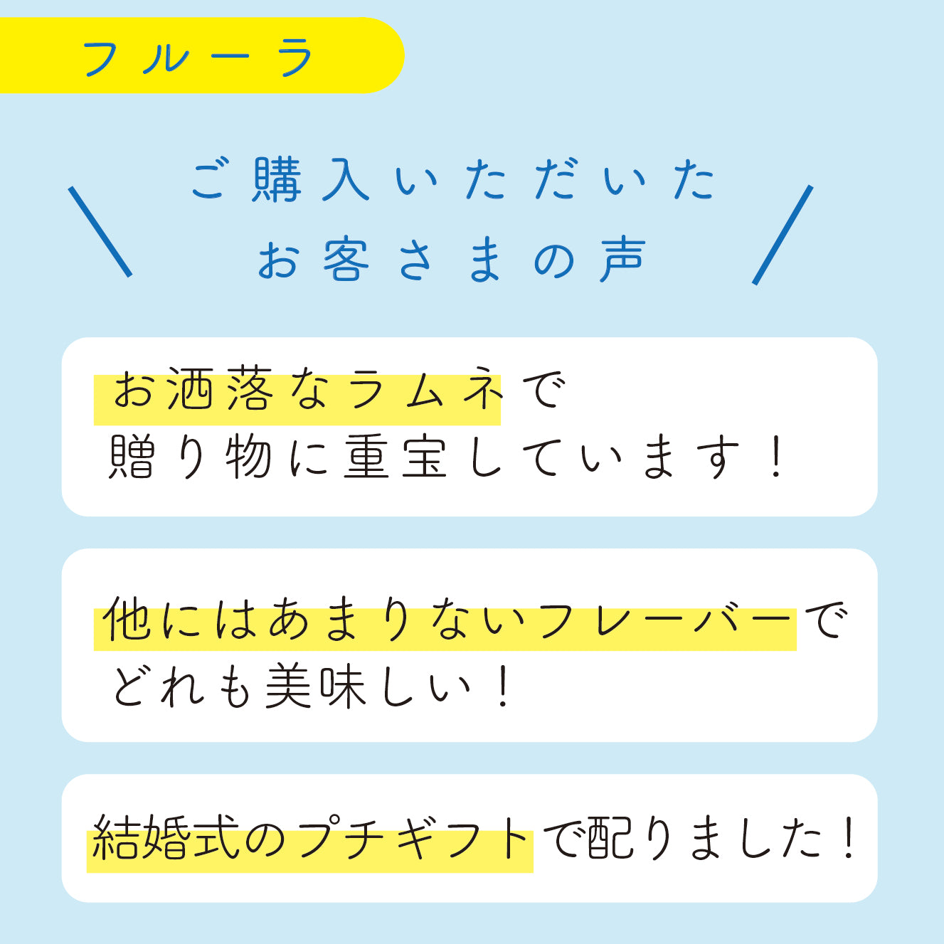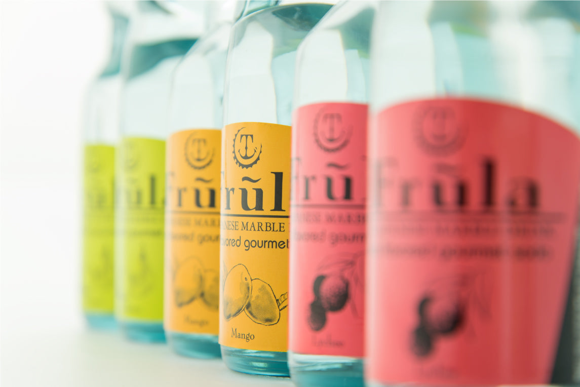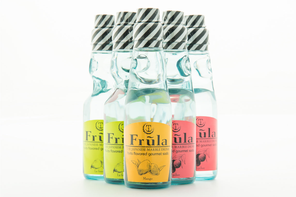 果実のフレーバーを使って、ネーミング・パッケージともにオシャレに仕上げた炭酸飲料です。「Frula(フルーラ)」の語源は、果実の「Fruit(フルーツ)」と「Lamune(ラムネ)」 」の造語に、花のイメージ「フローラ」を掛け合わせたもの。容器は、弊社創業以来の商品でもあるラムネ瓶を使用しました。